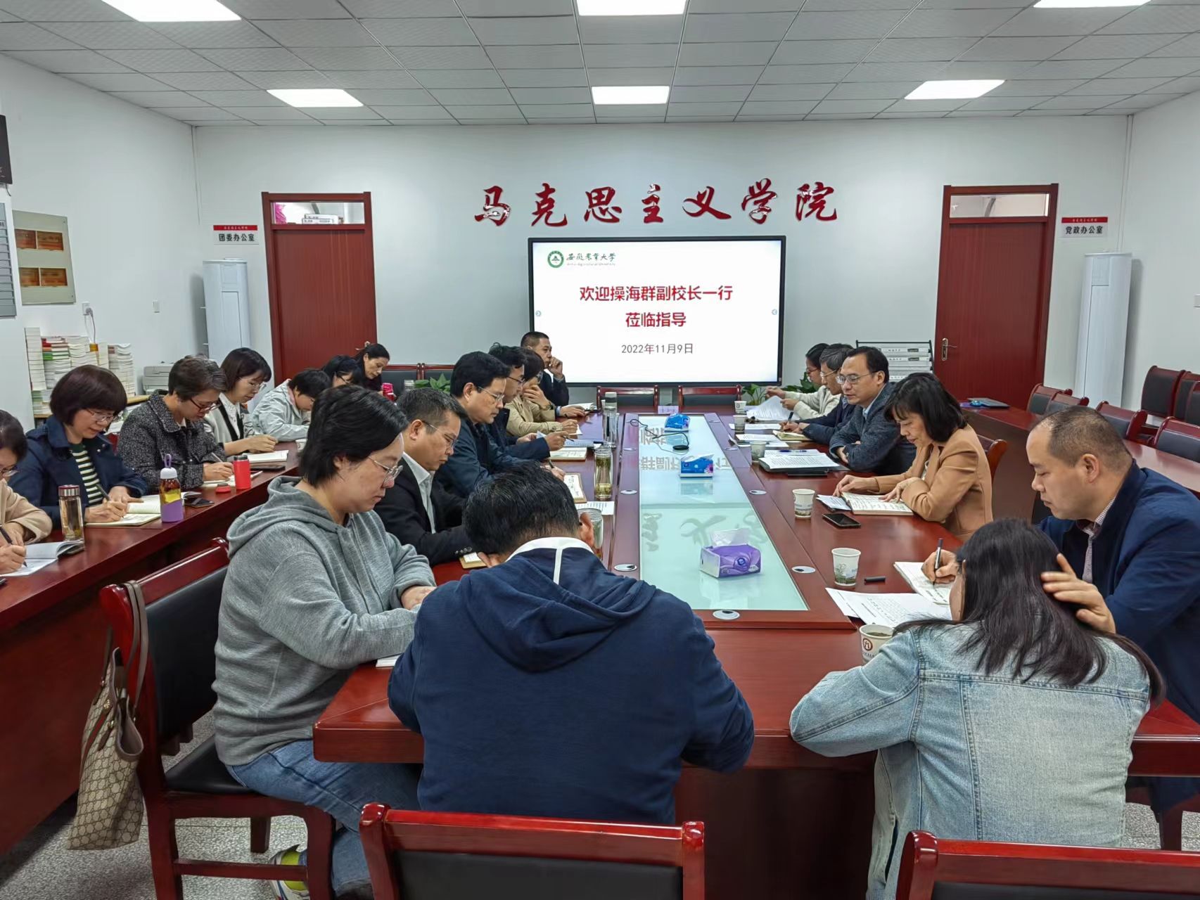 本网讯 11月9日,校党委常委、副校长操海群到马克思主义学院就科研团队建设、国家级项目工作进行调研,科技处等部门负责同志参加了调研。