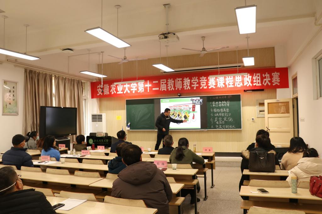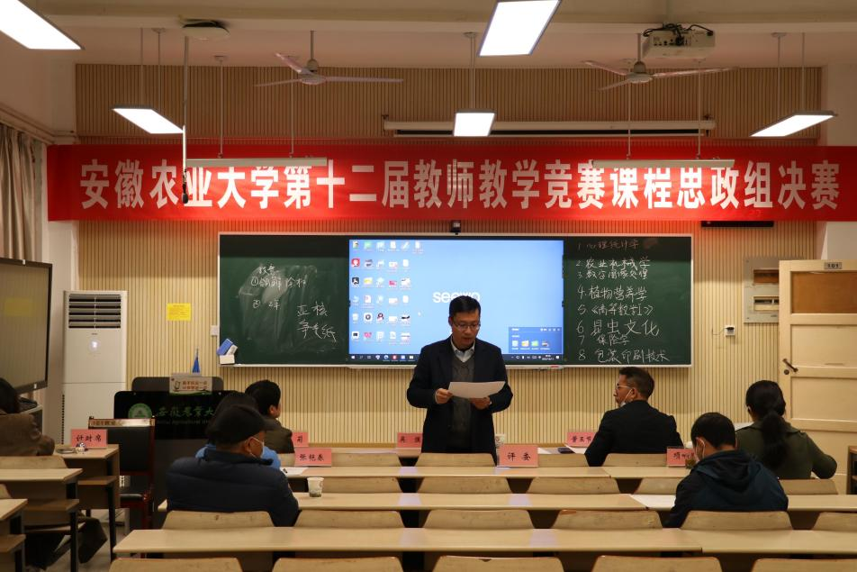 本网讯 为深入学习贯彻习近平总书记关于教育的重要论述,落实立德树人根本任务,推动课程教学改革,增进相互间学习和交流,促进教师更新教育理念、改进教学方法和手段,提高教学质量,2022年12月11日下午,安徽农业大学第十二届教师教学竞赛课程思政组决赛在马克思主义学院101智慧教室举行。中国科学技术大学教务处副处长吴强,合肥工业大学马克思主义学院副院长潘莉,安徽中医药大学马克思主义学院院长董玉节,安徽中医药大学教务处副处长张艳春,合肥学院教务处副处长项响琴,校工会主席刘惠东,教师工作部副部长孙福共7名校内外专家担任本次竞赛的评委,教务处(教师发展中心)副处长徐峰到会并主持本次竞赛,马克思主义学院党委副书记、纪委书记、副院长袁修雨全程参加了本次竞赛。本次竞赛同时通过腾讯会议进行线上观摩。