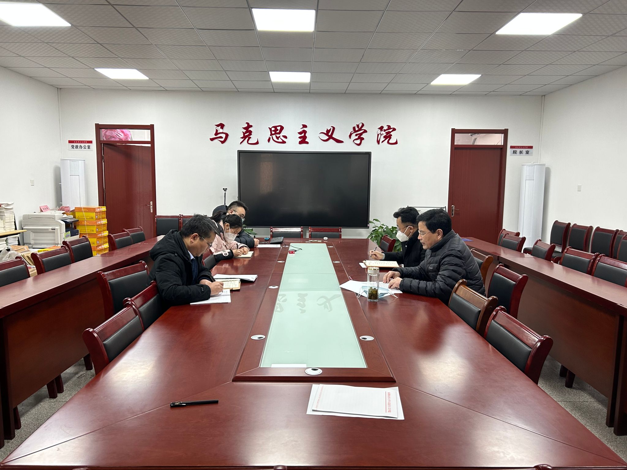 本网讯 为认真开好2022年度处级以上党员领导干部专题民主生活会,深入贯彻落实党的二十大精神,1月12日上午,马克思主义学院党政领导班子开展专题学习,副院长方国武、党委副书记、纪委书记、副院长袁修雨出席会议,院党委书记孙超主持会议。
