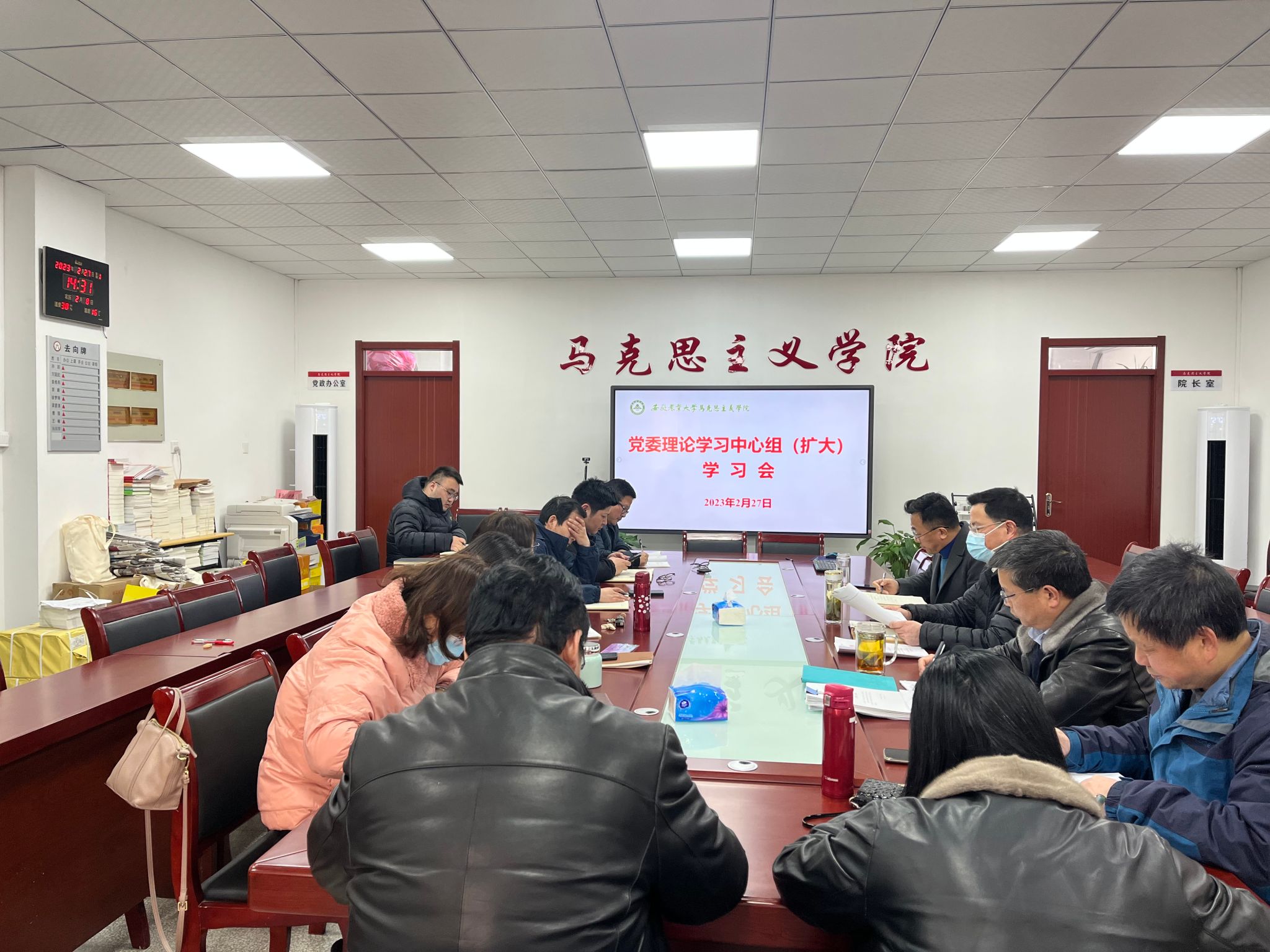 本网讯 2月27日下午,马克思主义学院在人文楼302室召开党委理论学习中心组(扩大)会议,开展理论学习研讨,部署重点工作,会议由院党委书记孙超主持。院党委副书记、院长方国武,院党委副书记、纪委书记、副院长袁修雨以及各党支部书记、教研部(中心)主任等参加了会议。