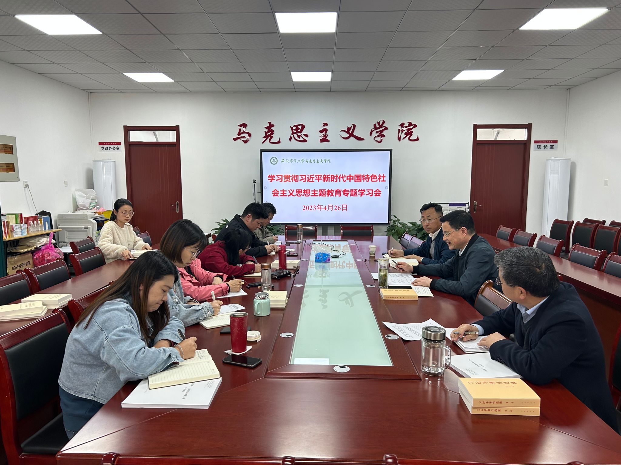 本网讯 4月26日下午,马克思主义学院在人文楼302室召开学习贯彻习近平新时代中国特色社会主义思想主题教育读书班开班暨党委理论学习中心组专题学习会。院党委书记孙超主持会议,院党委副书记、院长方国武、院党委副书记、纪委书记、副院长袁修雨以及学院各党支部书记、各教研部、中心主任等参加了会议。