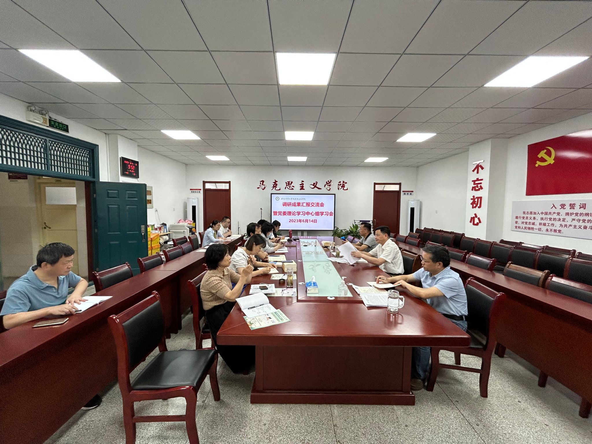 本网讯 6月14日上午,马克思主义学院党委在302会议室召开学习贯彻习近平新时代中国特色社会主义思想主题教育调研成果汇报交流会暨党委理论学习中心组学习会,研究部署相关工作,学院党委书记孙超主持会议。学院党委副书记、院长方国武,党委副书记、纪委书记、副院长袁修雨,各党支部书记,教研部(中心)主任等参加会议。