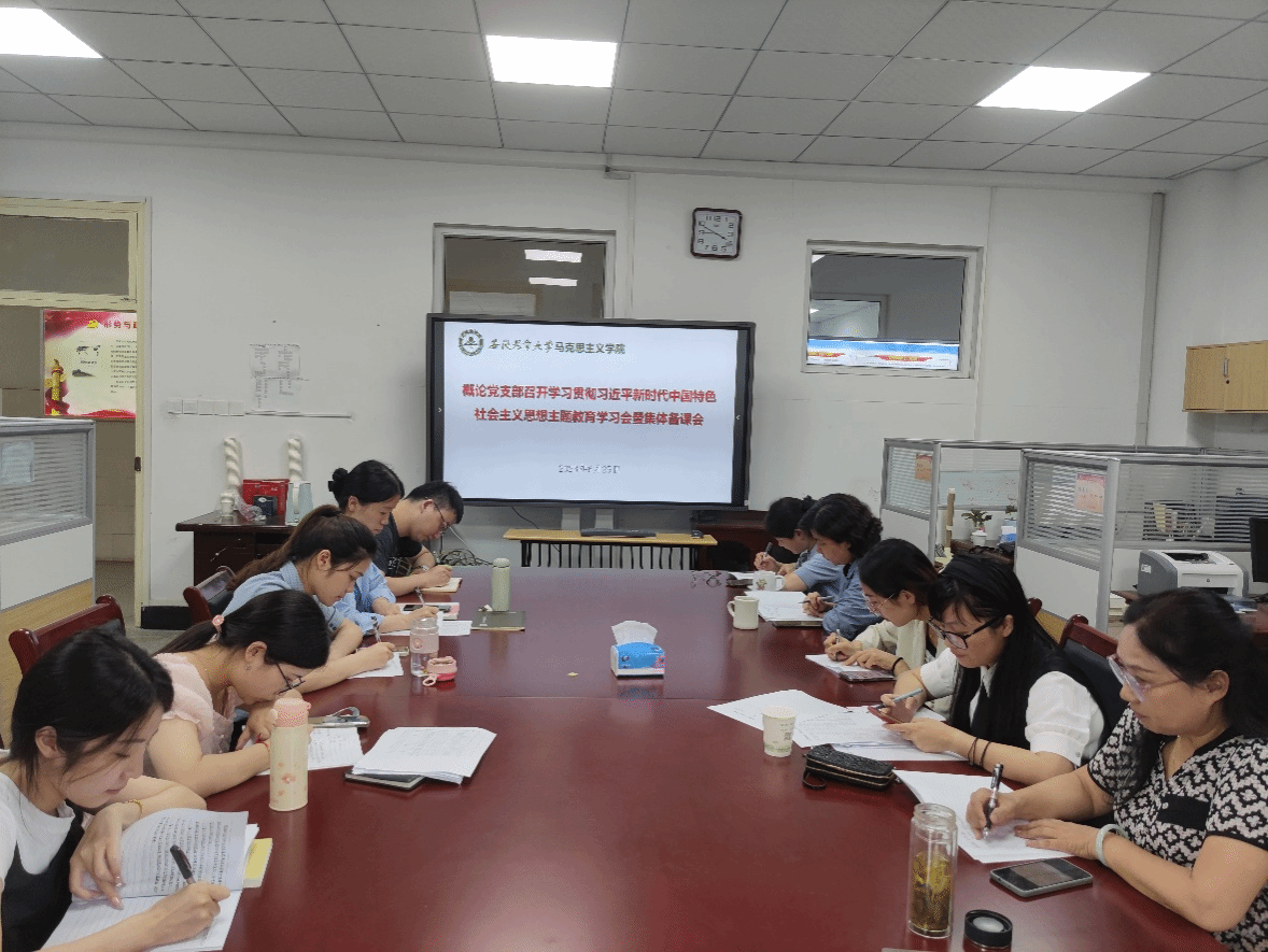本网讯 6月25日下午,概论党支部在马克思主义学院303室召开学习贯彻习近平新时代中国特色社会主义思想主题教育专题学习会暨集体备课会,党支部全体党员参与,会议由党支部书记周丽主持。