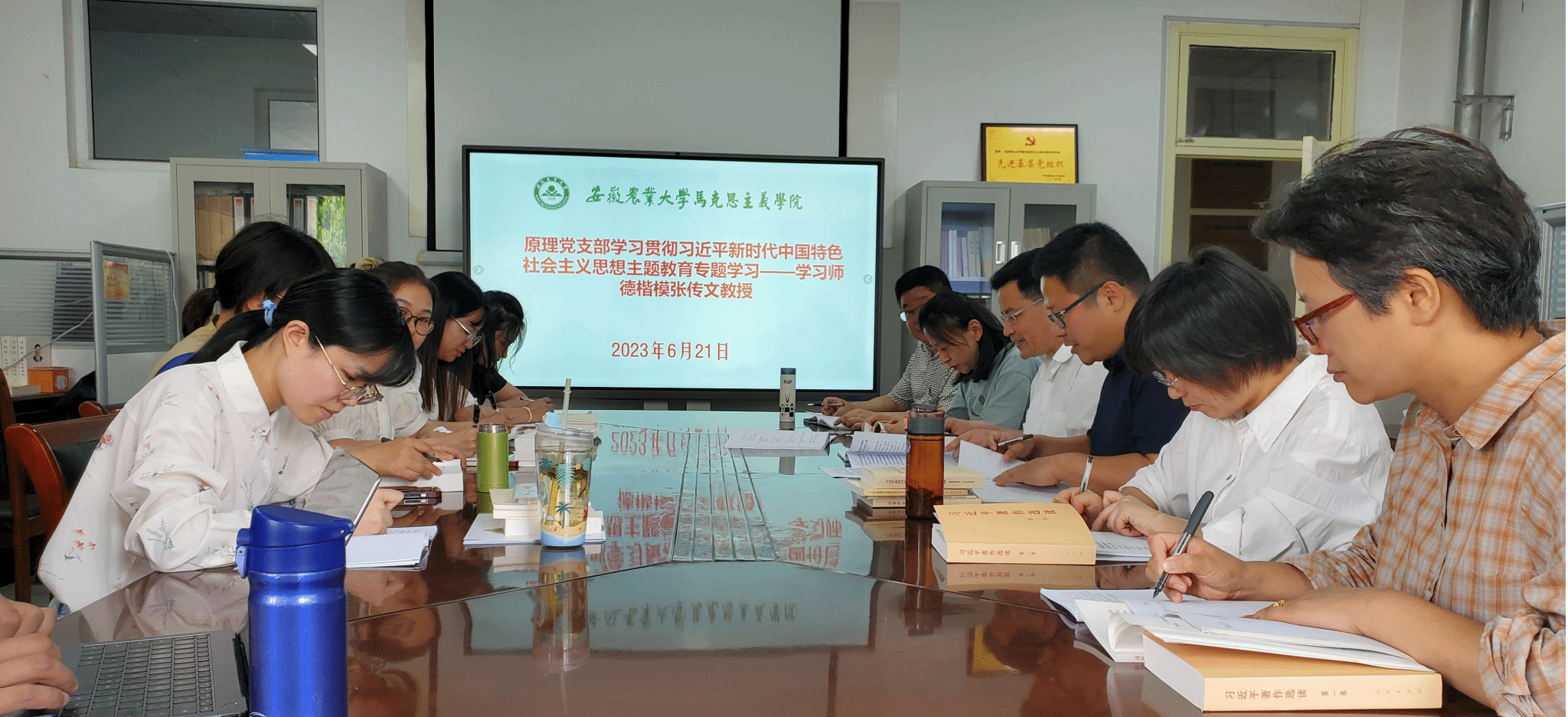 本网讯 6月21日下午,马克思主义基本原理党支部在人文楼301室召开学习贯彻习近平新时代中国特色社会主义思想主题教育专题学习暨学习师德楷模张传文教授“一月一主题”会。院党委书记孙超及教研部党支部教师参与了此次会议,会议由党支部书记徐玉祺主持。