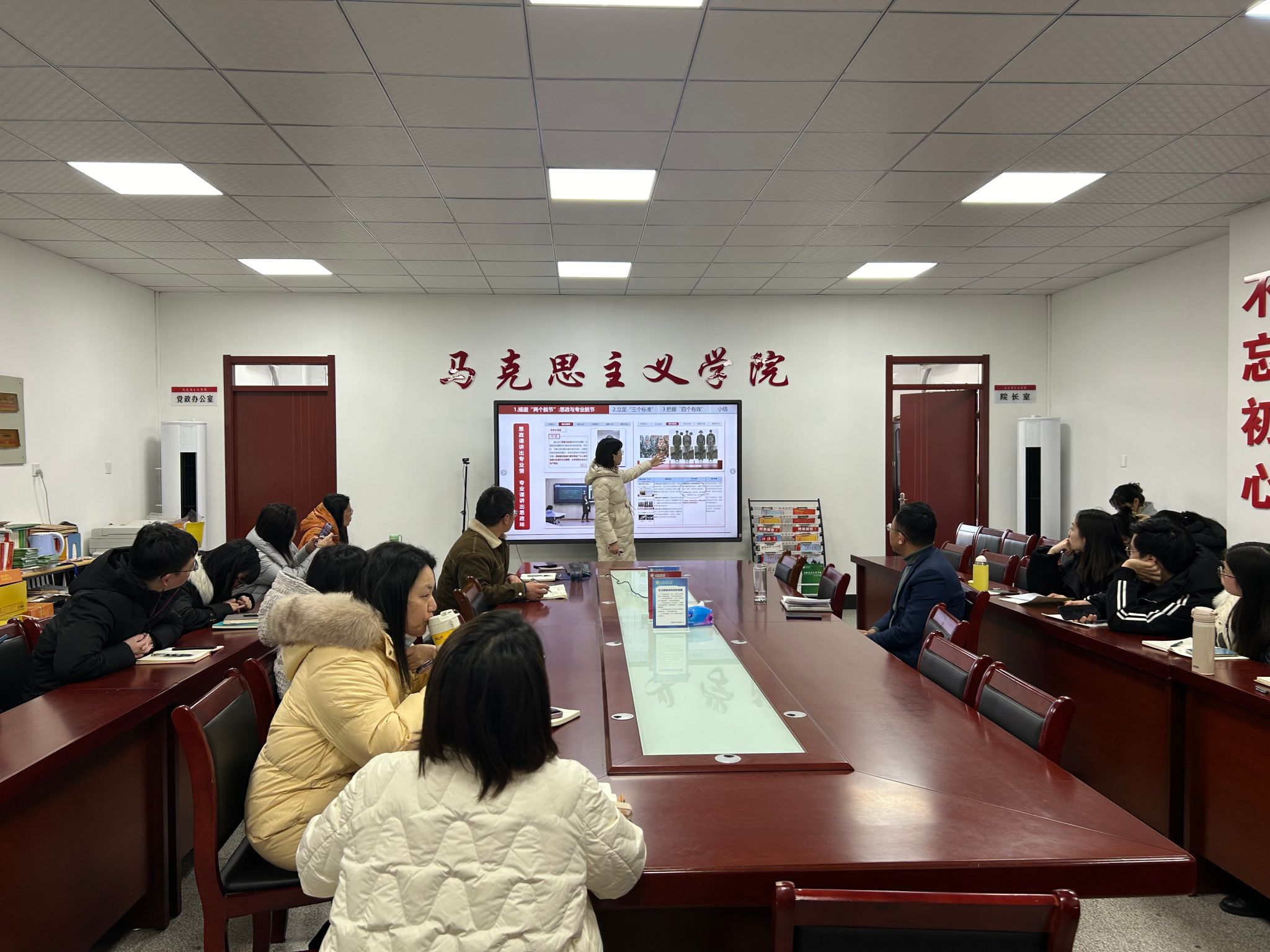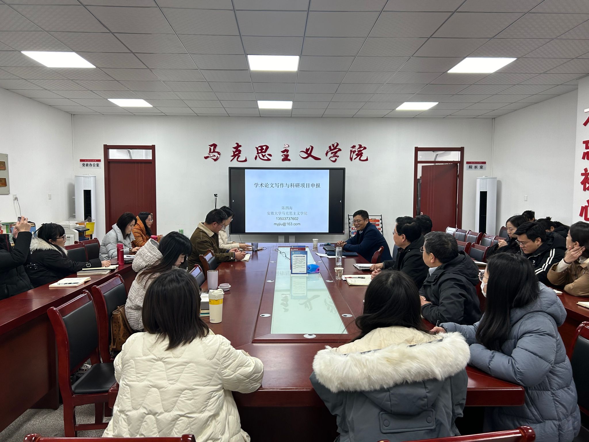 本网讯 为进一步帮助青年教师成长成才,进一步提升青年教师教学科研水平,全面加强青年教师队伍建设,12月21日下午,马克思主义学院在人文楼302室召开举行青年教师综合素质能力提升工程(第三季),安徽大学陈四海教授作思政课教师如何做好科研暨国家级项目申报讲座、安徽省第六届高校青年教师教学竞赛一等奖获奖教师王晶晶作教学交流分享。院党委书记孙超、院党委副书记、纪委书记、副院长袁修雨、青年教师和学院部分研究生等参加了讲座,院党委副书记、院长方国武主持讲座。