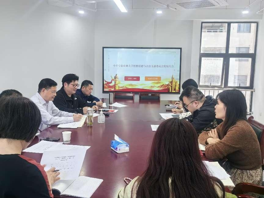 4月18日,思想道德与法治党支部在勤业楼701召开党员大会,开展“一月一主题”集体学习,部署当前主要工作,学院党委书记孙超和党支部全体党员参加会议,党支部书记吕岩主持会议。