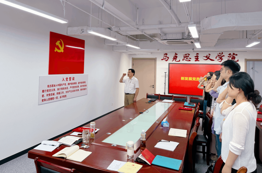 随后,孙超带领学院2024年上半年全体新发展党员进行入党宣誓。其他与会党员也一同宣誓,重温入党誓词。