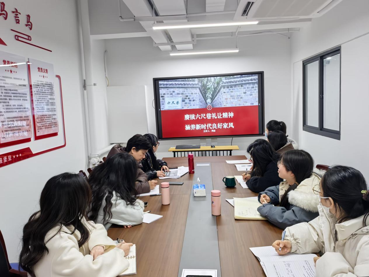 随后,周丽以“赓续六尺巷礼让精神 涵养新时代良好家风”为题讲授党课。周丽从“六尺巷精神的历史溯源与时代新篇”、“礼让精神:新时代家风建设的坚实根基”、“赓续六尺巷礼让精神的时代路径”、“以礼让精神涵养良好家风的实践蓝图”这四个方面,详实、生动、全方位地阐释了六尺巷精神,让各位党员深刻体会中华民族礼让、和谐的传统美德,深刻感悟中华优秀传统文化魅力和时代价值。教师们纷纷表示要继续深入学习贯彻习近平新时代中国特色社会主义思想,牢记“为党育人、为国育才”使命,将六尺巷精神与立德树人相结合,不断增强责任感和使命感,将学习成果转化为推进学校高质量发展的实践动力。