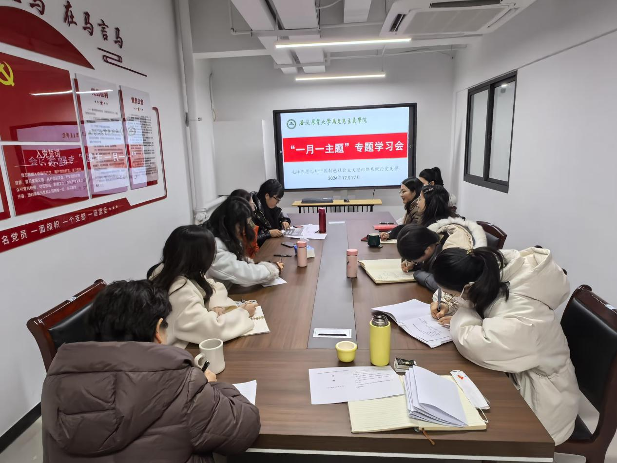 本网讯 2024年12月27日下午,毛泽东思想和中国特色社会主义理论体系概论党支部在马院819会议室召开“一月一主题”专题学习会,党支部全体教师参加会议,会议由党支部书记周丽主持。