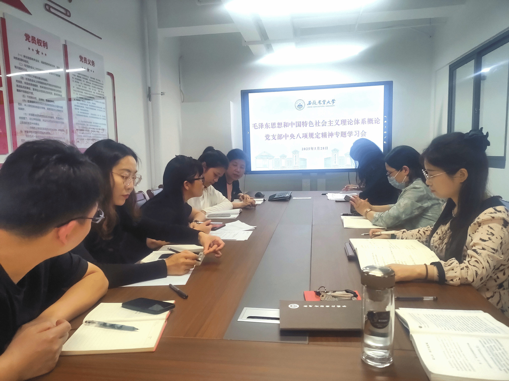 周丽就中央八项规定及其实施细则进行了专题辅导授课,详细解读了中央八项规定的具体内容与出台背景,并在提高政治站位、强化责任落实和深化学习教育方面对党支部全体成员提出了三点要求。会议围绕《党的十八大以来深入贯彻中央八项规定精神的成效和经验》《中国共产党第二十届中央委员会第二次全体会议公报》《党政机关厉行节约反对浪费条例》《新时代教师职业行为十项准则》等内容展开深入学习。与会党员一致认为,中央八项规定精神是新时代全面从严治党的重要抓手,必须将其深植于教育工作中,以实际行动践行党的初心与使命,为推动学院发展、助力国家教育事业贡献力量。