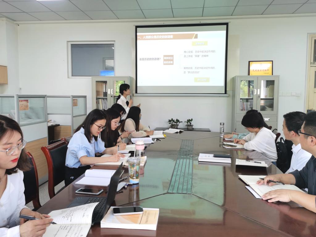 会议第二部分,由张思嘉老师作《人民群众在历史发展中的作用》教学展示,课堂以先说课后讲课的教学形式展开,通过一系列贴近学生日常生活和现实事例分析“人民群众在创造历史的中的决定力量”这一原理,最后以知识框图的形式对本小节进行总结。