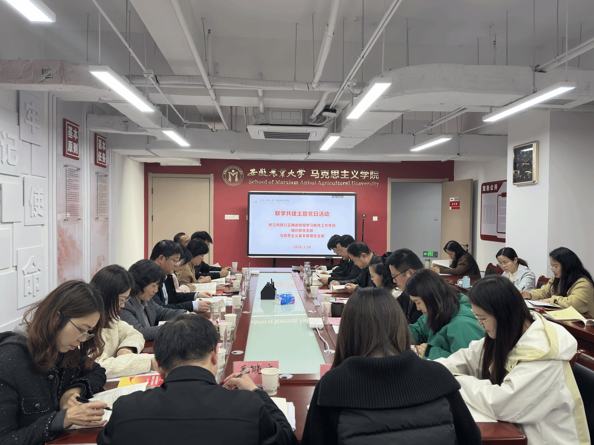 本网讯 为深入学习贯彻习近平总书记关于树立和践行正确政绩观的重要论述,推动党建与业务深度融合,2026年3月30日下午,组织部党支部、学校树立和践行正确政绩观学习教育工作专班与马克思主义基本原理党支部联合开展“联学共建强党性 树立正确政绩观”主题党日活动。校党委常委、党委组织部部长、马克思主义学院党委书记韩弥明出席活动并作总结讲话。活动由马克思主义学院副院长、马克思主义基本原理党支部书记徐玉祺主持。