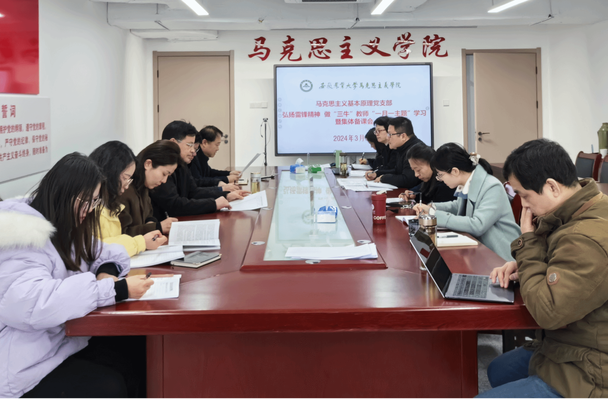3月8日上午,马克思主义基本原理党支部开展“弘扬雷锋精神,做‘三牛’教师”一月一主题学习暨集体备课会。学院党委书记孙超、党支部全体党员教师参加此次会议,会议由党支部书记徐玉祺主持。