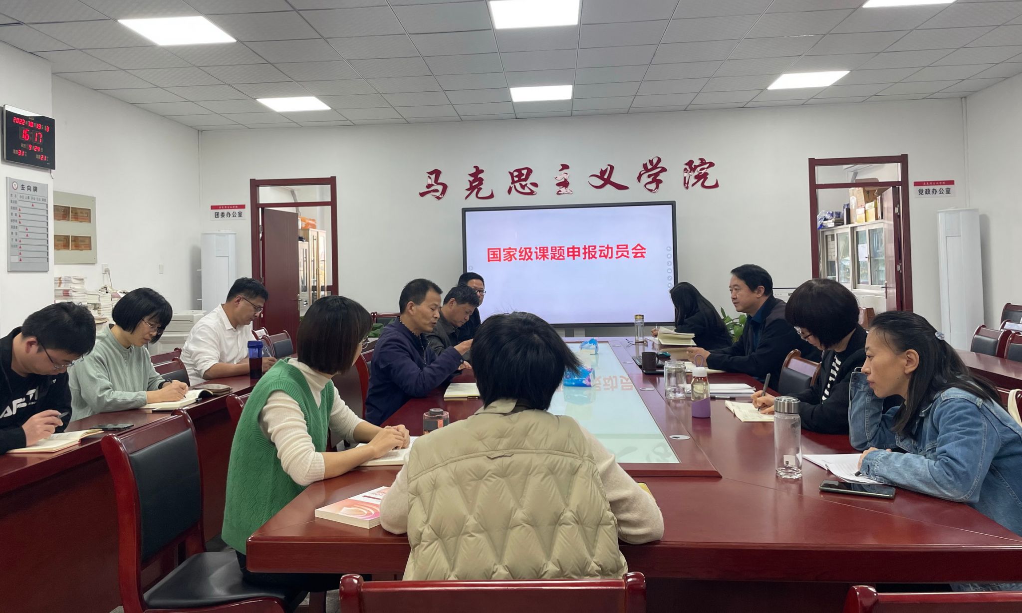 国家级课题申报动员会通报了本年度学院国家社科基金申报的指标任务和符合申报条件的教师情况。会议认为,要制定申报国家级项目的考核办法,鼓励所有符合条件的老师积极申报相关项目。学院对申报书进行评审择优推荐至学校。
