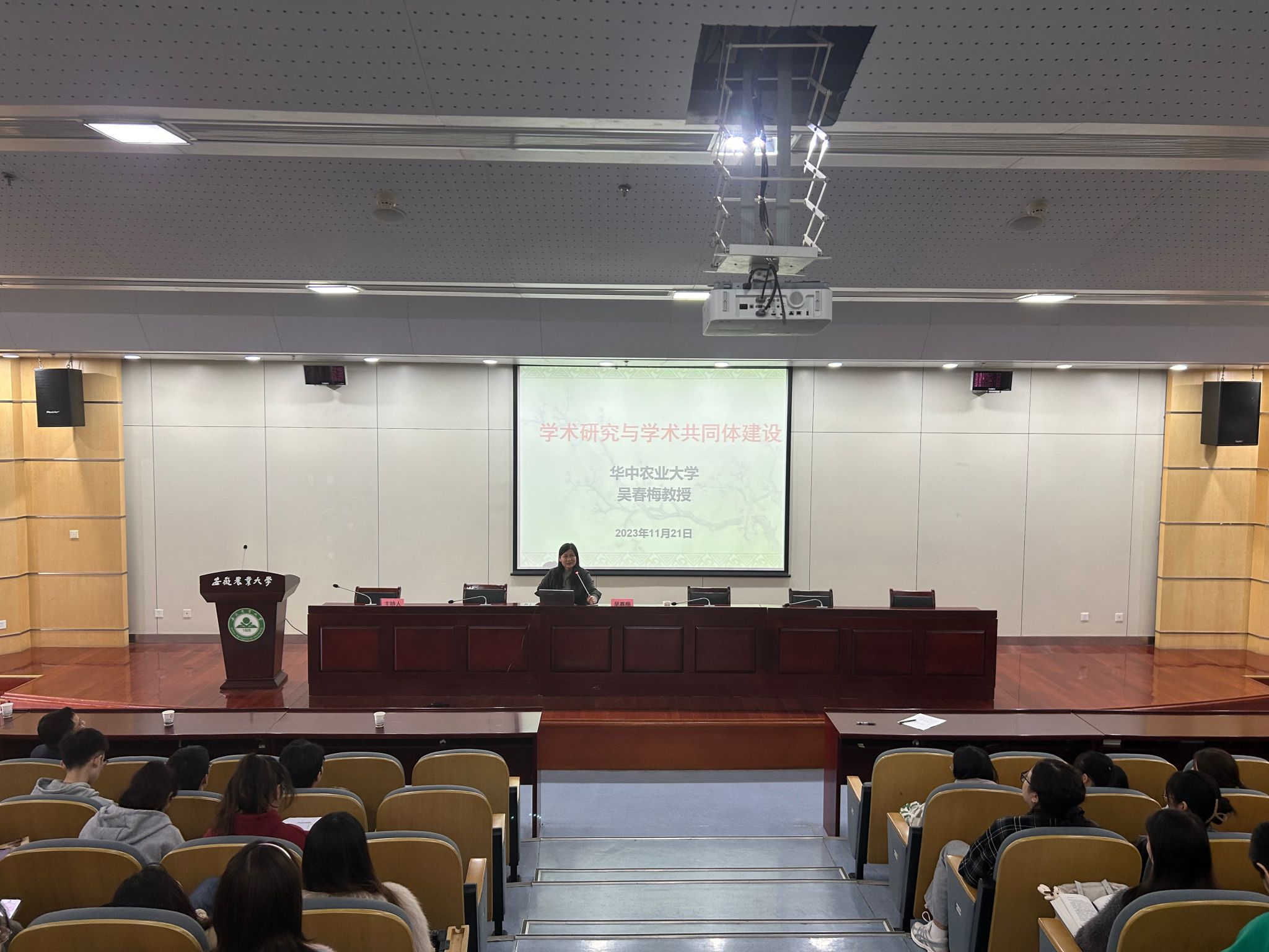 本网讯 11月21日,华中农业大学马克思主义学院博士生导师吴春梅教授,应邀在图书馆第二报告厅为马院师生作题为“学术研究与学术共同体建设”的学术报告,学院党委书记孙超、部分教师以及研究生参加此次讲座,讲座由院长方国武主持。