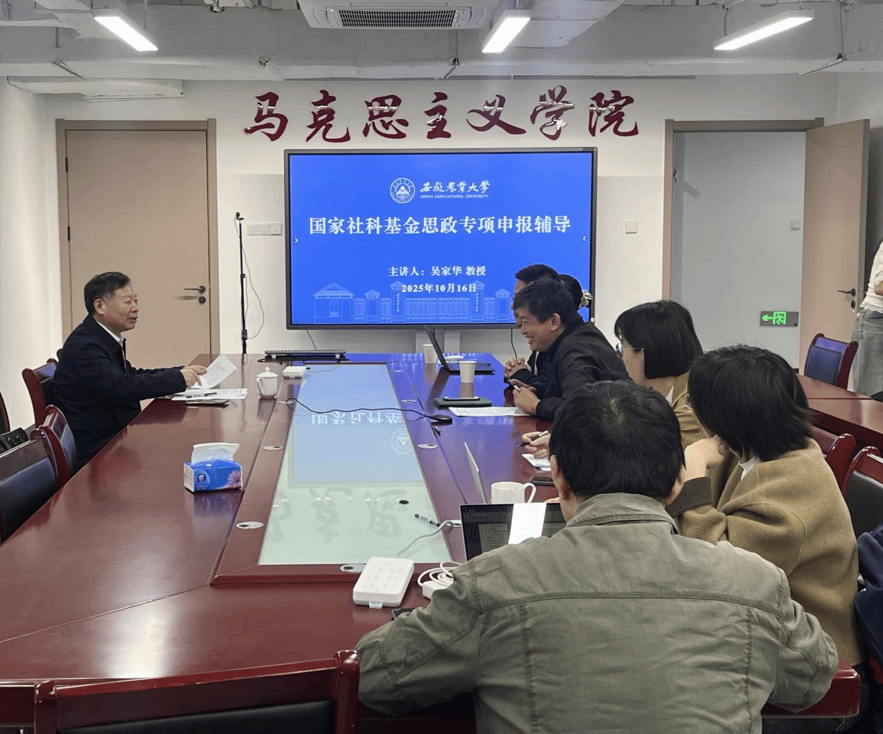 本网讯 为深入推进马克思主义理论学科高质量发展,近日,我院举办了2026年国家社科基金思政专项申报辅导会,分别邀请同济大学马克思主义学院陈大文教授(线上)、安徽大学马克思主义学院吴家华教授对本年度申请国家社科基金思政专项的申报书进行指导。