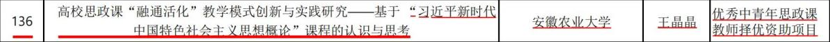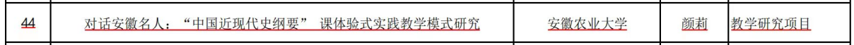 本网讯 近日,教育部社科司公示2023年度高校思想政治理论课教师研究专项一般项目评审结果,我院副教授、博士颜莉主持的课题《对话安徽名人:“中国近现代史纲要”课体验式实践教学模式研究》成功立项教学研究项目。副教授、博士王晶晶主持的课题《高校思政课“融通活化”教学模式创新与实践研究——基于“习近平新时代中国特色社会主义思想概论”课程的认识和思考》成功立项优秀中青年思政课择优资助项目。本年度马院同时获得两项教育部课题立项资助,实现了新的突破,展示了我院青年教师良好的综合素质和教学研究能力,这也是我院自2018年以来连续6年获得国家级项目资助。