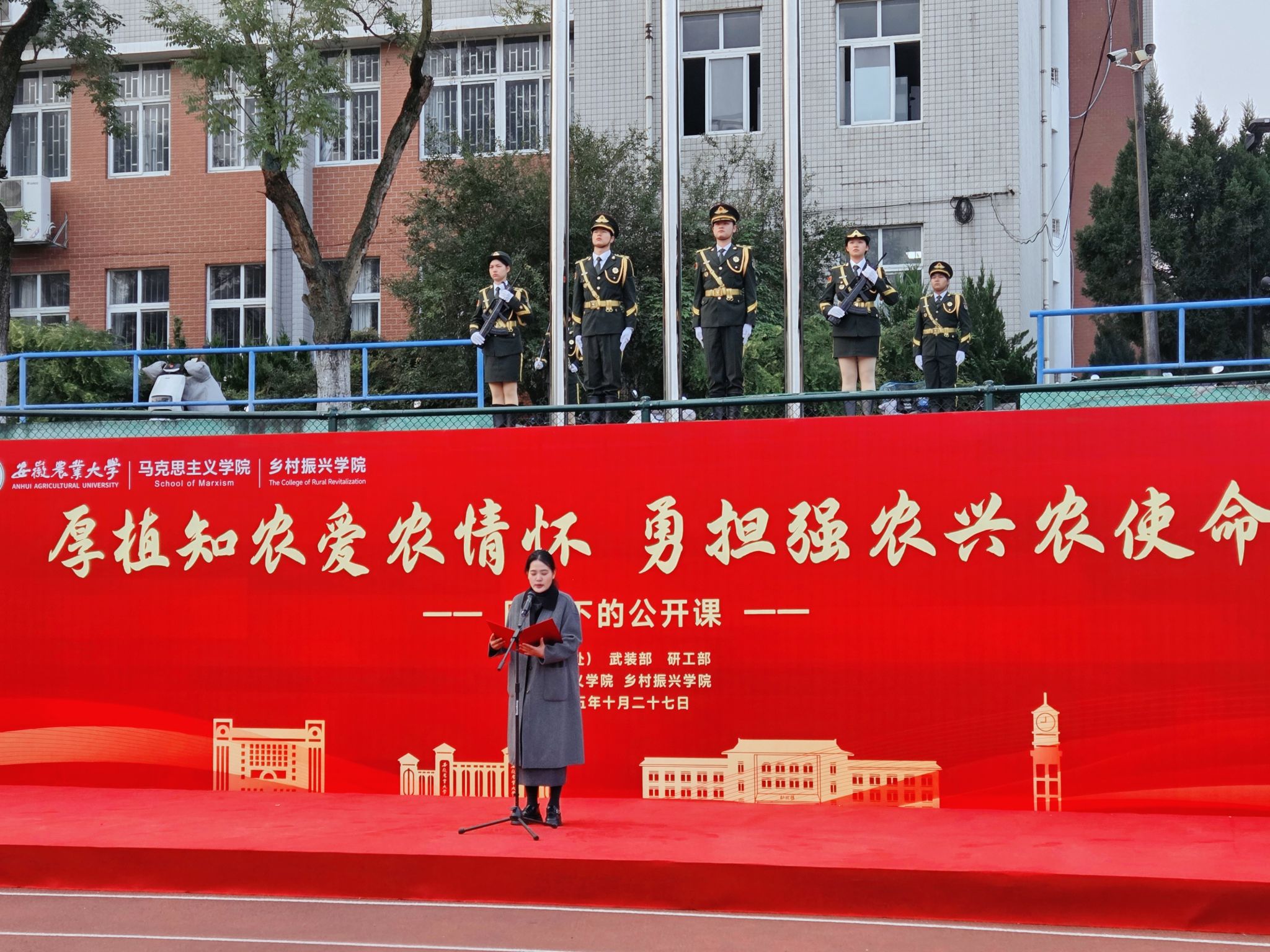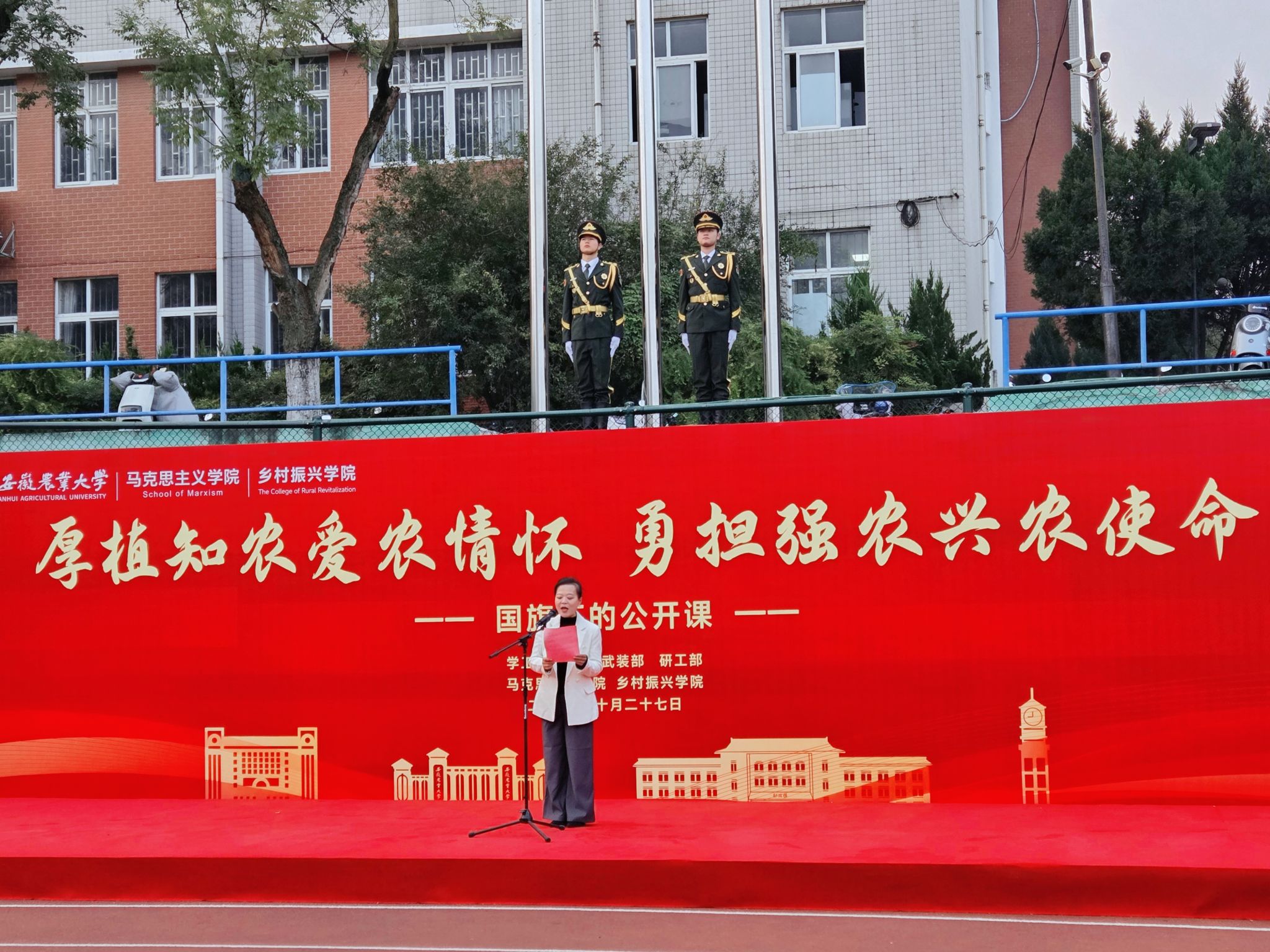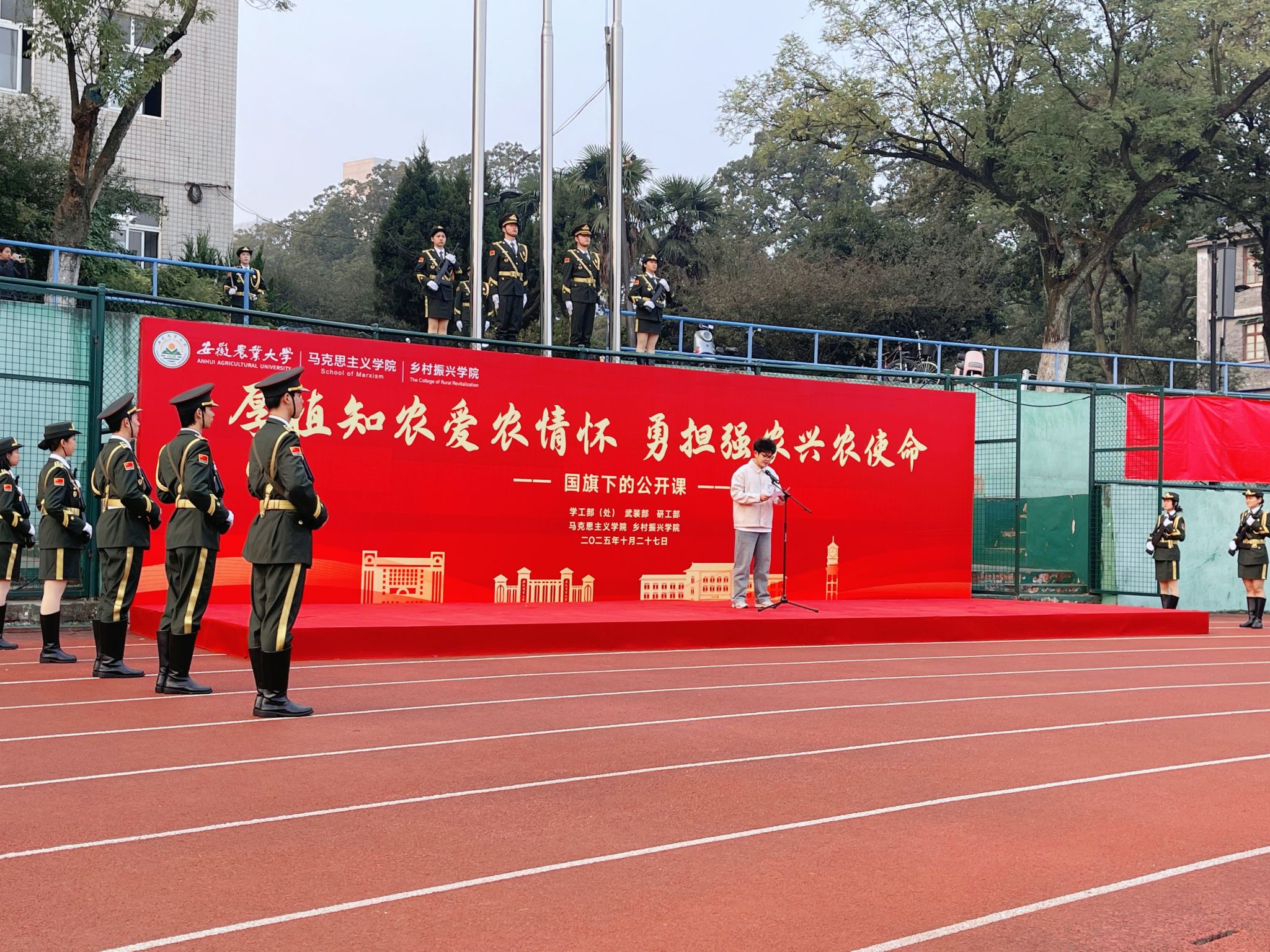 本网讯 10月27日清晨,马克思主义学院与乡村振兴学院在校第一运动场联合举办“厚植知农爱农情怀,勇担强农兴农使命”国旗下公开课,以跨学院协同育人模式,将思政引领与专业教育结合,强化师生服务“三农”的使命担当。校党委常委、组织部部长、马克思主义学院党委书记韩弥明,校党委研究生工作部部长唐红萍,校学生处副处长、学生资助管理中心主任吕大鹏,马克思主义学院和乡村振兴学院领导班子成员、师生代表共同参与,活动由马克思主义学院院长苏洁主持。