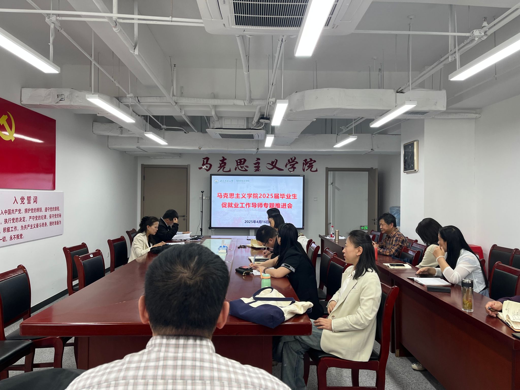 本网讯 为深入贯彻落实党中央、国务院“稳就业”“保就业”决策部署,扎实推进学院毕业生就业工作,4月16日下午,马克思主义学院在1010会议室召开2025届毕业生促就业导师专题推进会。会议由学院院长苏洁主持,全体毕业生导师、毕业班班主任、就业联络员等参加会议。